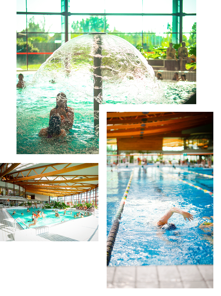 Espace ludique – éclat de rire garanti : bassin de 300 m² avec bain bouillonnant, jets massants, canons à eau et rivière à contre-courant, pataugeoire pour les tout-petits, toboggan géant de 80 m qui serpente entre intérieur et extérieur (dès 6 ans).